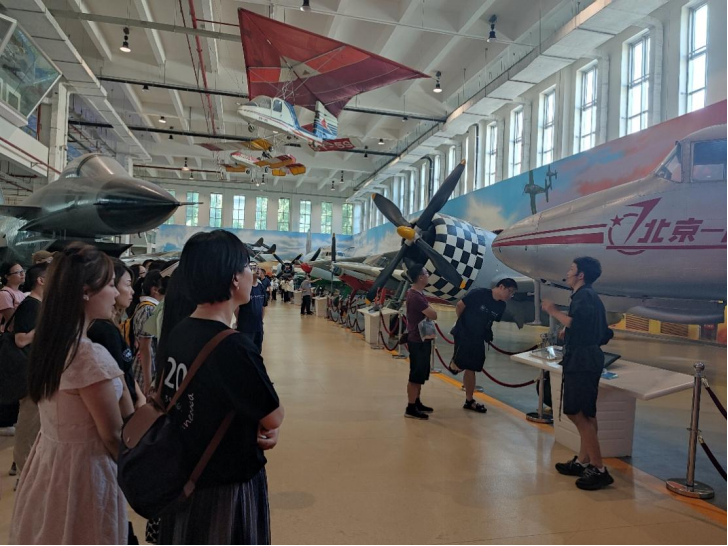 随后,大家来到了航空航天博物馆。二十年前,校友们在航空航天博物馆学习知识,二十年后,他们再次走进翻新后的航空航天博物馆,旧日学习的情景一一浮现在眼前,欣喜地讨论着学校的巨大变化,还不断的与身边的亲友们分享着在北航度过的美好青春,感慨万千,欣喜母校现在的日新月异。之后,跟随讲解员的脚步,校友们又先后参观了各式各样的航空发动机和机载设备,瞻仰了由北航师生用100天亲手打造的国内第一架轻体客机“北京一号”、铁翼银鹰“歼10-A”战斗机、黑寡妇战机、“鹞”式战机等展馆之宝。(见图4、图5)