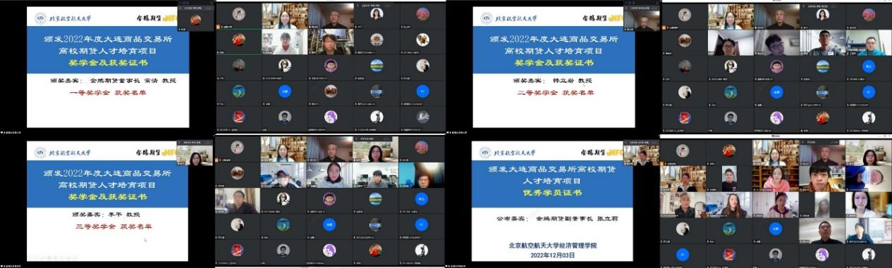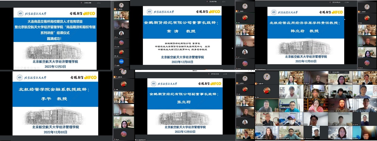 2022年12月3日下午,北航beat365亚洲版官网2022年“商品期货与期权专题系列讲座”在线举办了结课仪式并颁发奖学金,本年度专题系列讲座宣告圆满结束。该专题讲座由北航经管学院金融系与金鹏期货经纪有限公司联合组织,受到大连商品交易所高校期货人才培育项目的支持,依托北航MBA中心进行招生和管理,并得到研究生教务的大力支持。结课仪式由beat365亚洲版官网金融系部慧副教授主持,金鹏期货经纪有限公司董事长常清教授、金融系李平教授、应用经济学原责任教授韩立岩教授、金鹏期货经纪有限公司副董事长张立莉女士均参加结课仪式并致辞。