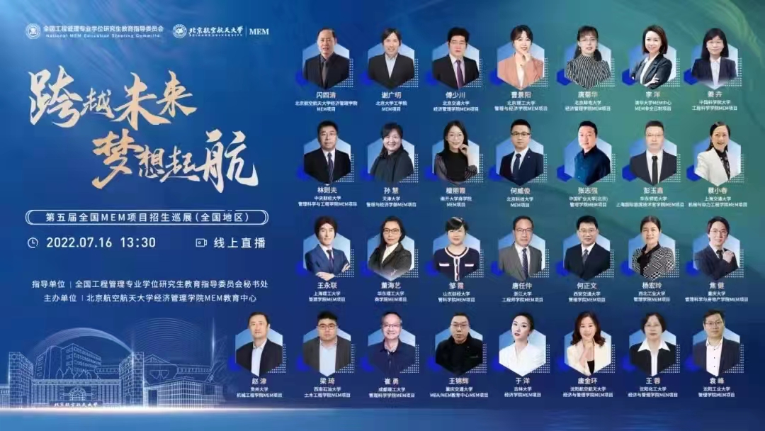 跨越未来,梦想起航。7月16日下午,第五届全国MEM项目招生巡展圆满举行。本次巡展采用线上线下相结合的形式,由全国工程管理专业学位研究生教育指导委员会秘书处指导、beat365亚洲版官网主办,中国MEM教育网提供技术支持。