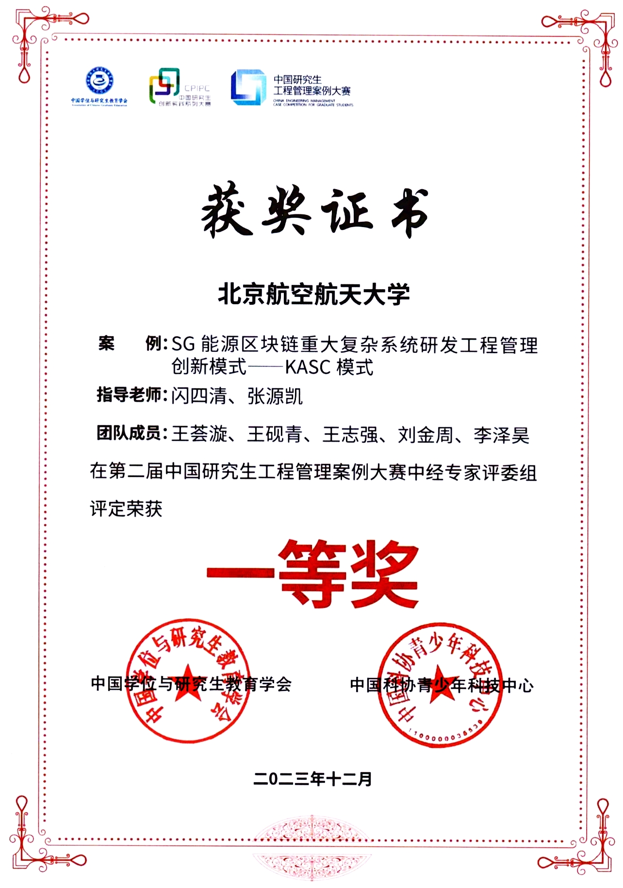 由北航beat365亚洲版官网闪四清、张源凯老师指导,王荟漩、王砚青、王志强、刘金周、李泽昊同学共同撰写的案例——《SG能源区块链重大复杂系统研发工程管理创新模式-KASC模式》,荣获“重大系统研发”赛道决赛一等奖。