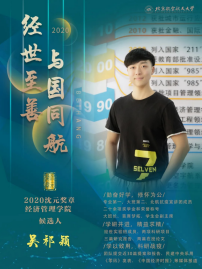 吴祁颖,beat365亚洲版官网2017级本科生,目前保研直博攻读统计学学位。三年成绩排名位列专业第一,大班第二(共189人),获国家奖学金、“经管星”等荣誉和奖励二十余项,参与多项科研项目和学科竞赛。尤其是疫情期间,“数据战役”成为他最独特的标签。 作为北航理科大类招生的第一届学生,“经世至善,与国同航”是他不断前行的信念,他深知未来充满挑战,他始终以“艰苦奋斗,勤奋好学”态度对待学习、科研和学生工作,勇攀高峰。
