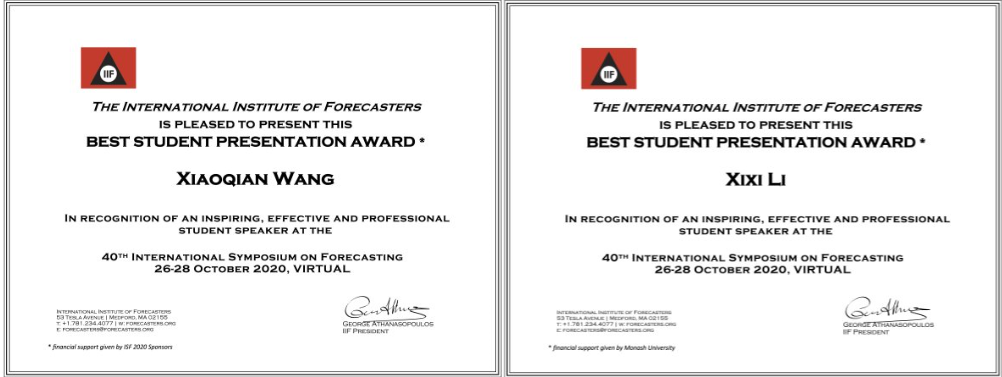 近日,第40届国际预测会议(International Symposium on Forecasting)以线上形式成功举办。beat365官网在校博士生王晓倩(2018级博士生)、硕士毕业生李茜茜(beat365官网2012级本科生,2016级硕士生,现曼彻斯特大学在读博士)在此次大会上分享了精彩的学术报告,并分别荣获最佳学生报告奖的第一名和第二名。此次大会共设三项最佳学生报告奖(Best Student Presentation Award),以鼓励最具启发性、最有效和最专业的学生报告者,并表彰他们的科学贡献和学术报告能力。