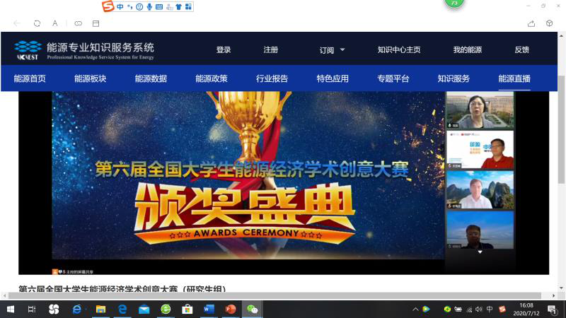 2020年7月11日-12日,第六届全国大学生能源经济学术创意大赛在线上举行,中国工程院网络平台进行了全程直播,来自全国各地高校的10000余名大学生和研究生聚会云端,观看了这次学术大赛。