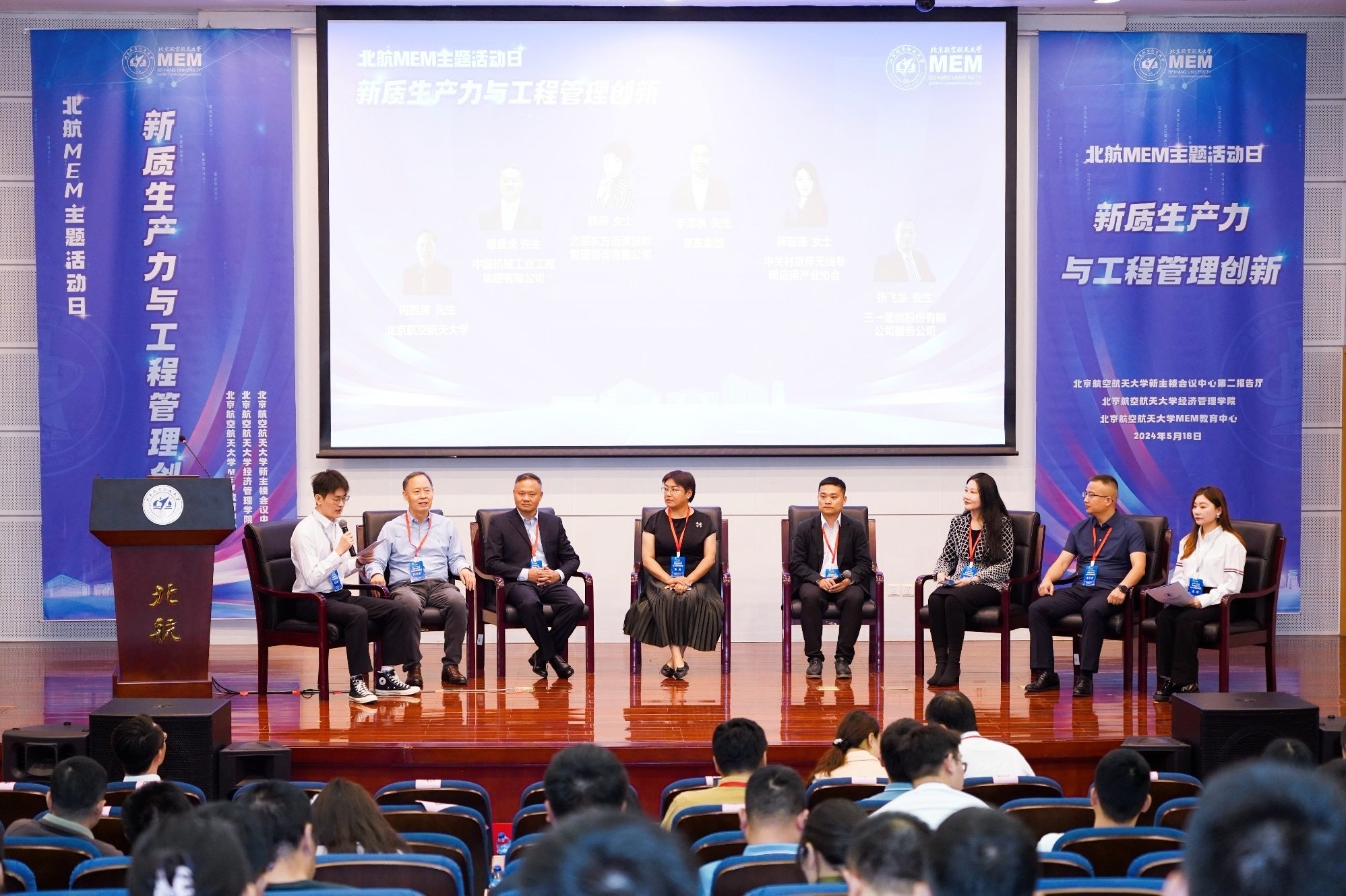 本次行业对话以《新质生产力与工程管理创新》为主题,受邀参与此环节的嘉宾有京东集团供应链产品研发部产品总监李清泉先生、北京东方迈道国际管理咨询有限公司总经理韩燕女士、中国机械工业工程集团有限公司事业部商务总监鄢盛虎先生、中关村宽带无线专网应用产业协会秘书长兼法人代表薛珊珊女士、三一重能股份有限公司服务公司副总经理张飞龙先生、beat365亚洲版官网MEM教育中心主任闪四清教授,此环节由北航MEM2023级董佳伟同学和常萌同学共同主持,代表同学们与各位行业专家进行互动交流。各位专家结合自身从业经验对新质生产力与工程管理创新话题进行了详实的阐述,全程干货、掌声不断。