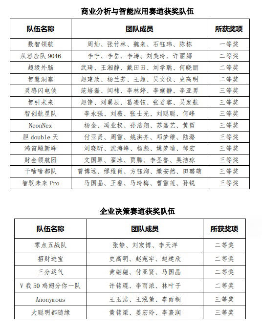 自比赛启动以来,北航MBA教育中心积极筹备,面向全体MBA在校生,组织多次专项培训,并举办校内选拔赛,指导老师和各支队伍积极备赛,中心也为参赛队伍提供了全面的支持。本次大赛,北航MBA共有19支队伍进入复赛,获得奖项,企业决策赛道4支队伍获二等奖,2支队伍获三等奖,商业分析与智能应用赛道1支队伍获一等奖,3支队伍获二等奖,9支队伍获三等奖。