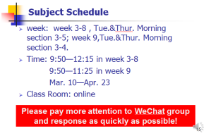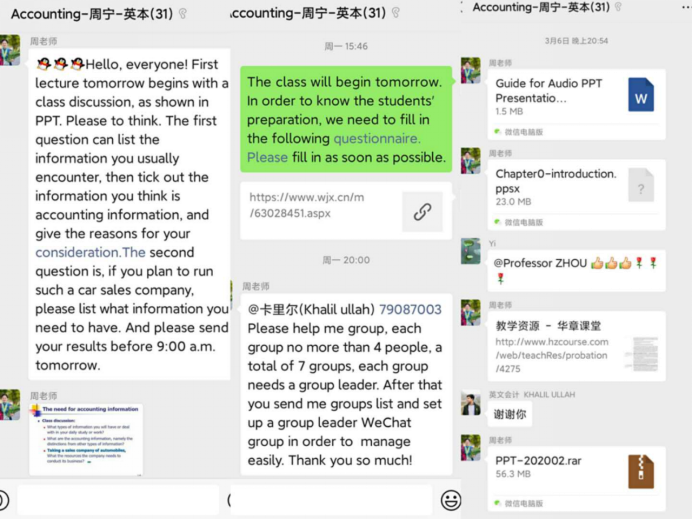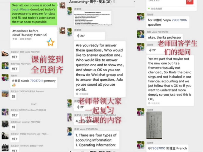 由于留学生生活在不同的国家,网络环境也不同,所以国内学生授课的腾讯课堂和腾讯会议的方式无法实施,只能通过留学生们都熟悉的微信功能开展教学。鉴于此种情况,留学本科生《会计学》的授课教师周宁教授采取有声PPT和该门课程自制的MOOC(2016年《会计学》获得教育部来华留学英语授课品牌课)相结合的方式,严格按照教学计划进行授课。开课前,学院教务、周老师和同学们都做好了充分的课程准备,学院教务朱伟老师建立微信群、周老师和助教王颖同学微信群分小组,实现对学生的网格化管理;周老师制作课程大纲有声PPT、助教制作有声PPT使用指南,使留学生们上课前知悉课程的所有安排和要求;微信群提前测试有声PPT和MOOC的使用,考察学生的反馈速度和网络使用情况;开展学生所在地域时差问卷调查,有针对性地安排教学计划。