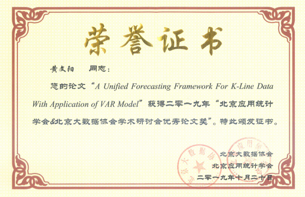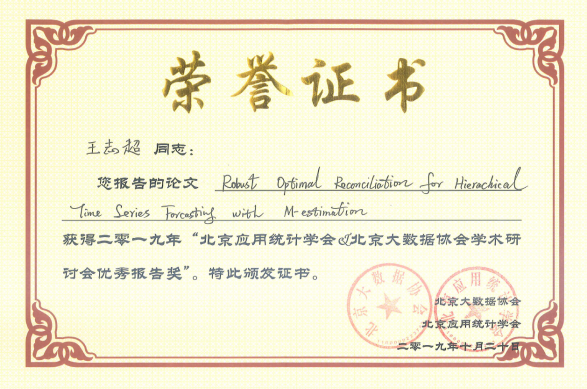 在最后的颁奖环节,博士生黄文阳的论文《A Unified Forecasting Framework For K-line Data With Application of VAR Model》荣获2019年“北京应用统计学会&北京大数据协会学术研讨会优秀论文奖”(共6名);博士生王志超的报告《Robust Optimal Reconciliation for Hierarchical Time Series Forecasting with M-estimation》荣获2019年“北京应用统计学会&北京大数据协会学术研讨会优秀报告奖”(共4名)。