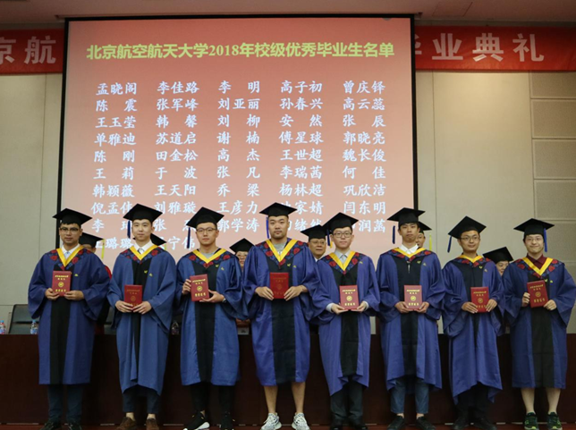 毕业典礼在庄严的国歌声中正式开始。党委书记刘志新教授、副院长秦中峰教授、副院长郑海涛副教授,及副院长张人千教授分别宣读了2018年夏季北京市优秀毕业生获奖名单、2018年夏季北航优秀毕业生获奖名单、2018年北航优秀硕士学位论文获得者名单,以及2018年北航优秀硕士学位论文指导教师名单。在热烈的掌声中,与会领导和嘉宾为获奖者颁发了荣誉证书,与获奖者温馨合影,并对他们的努力成果表达了肯定与祝贺。