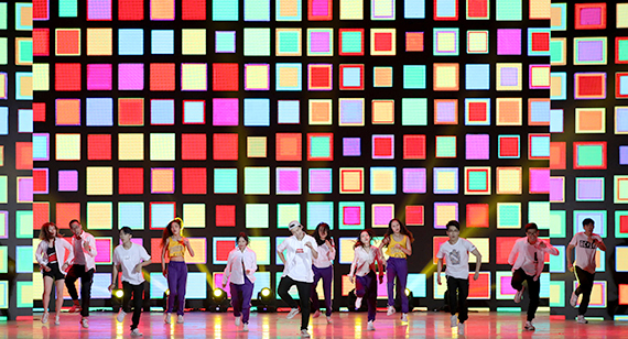 在激动人心的学院大点兵之后,伴随着飞行学院学生扇舞团编排的舞蹈《破风》,晚会正式拉开了帷幕。晚会以BUAA2018逐梦号飞船太空旅行的场景设定,分为“相遇·似水韶华”“相知·臻萃流年”“相守·凌霄寰宇”三个篇章,通过歌曲、相声、朗诵、舞蹈等形式的文艺节目,将各篇章串联起来,为全体师生献上了一份精彩的毕业大礼。