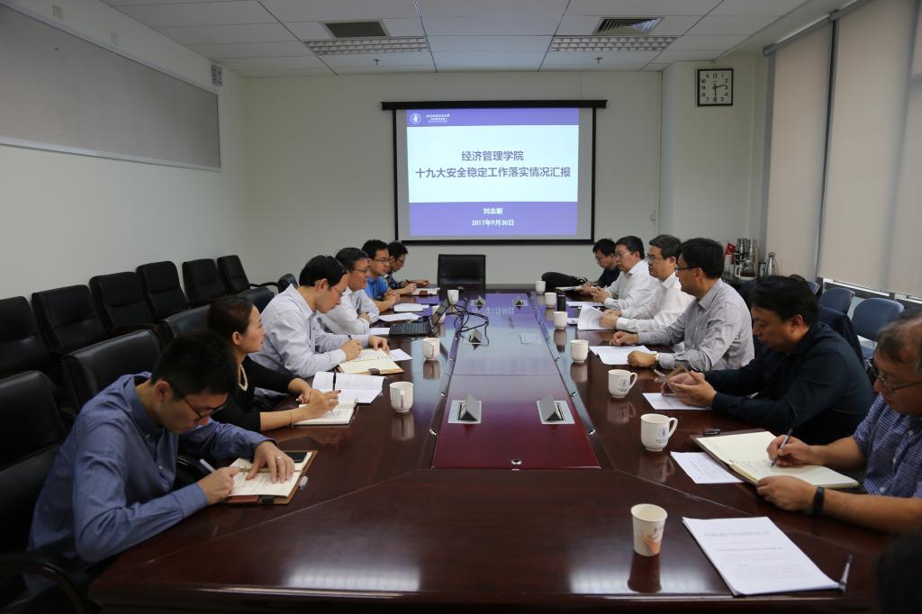 首先,张军书记一行听取了学院十九大期间安全稳定工作落实情况汇报。院党委刘志新书记代表学院从任务部署、责任落实、排查情况、宣传教育、应急处置等五个方面进行了详细阐释。经管学院在落实过程中,书记院长作为第一责任人负总责,全院上下高度重视,前期工作部署及时、制度完善、人员到位,责任明确、架构明了、分工明晰。在日常排查过程中,全院覆盖、不留死角,形成了一套高效的检查规范;在重点人和事摸排过程中,认真细致、台账清晰,及时化解当前师生中存在的突出矛盾;在整个防控过程中,管理措施和技术手段并重,争取做到早发现、早汇报、早处理。对近期的工作,在线上和线下做了充分的准备,特别加强网络的管控;全体班子成员和管理干部做好值班值守,严格落实应急信息报告制度。