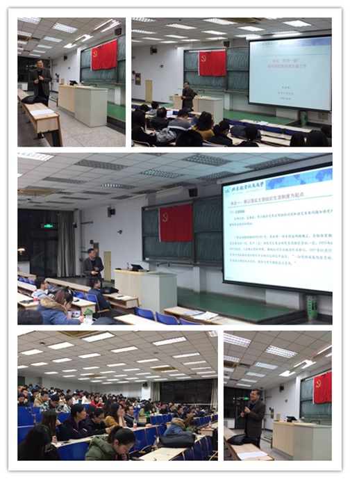 本次党课的主题是结合“两学一做”做好高校基层党支部工作。刘志新书记首先解释了为什么要给入党积极分子讲基层党支部工作。其最主要原因在于让入党积极分子了解党支部的工作内容,知道成为党员之后需要干什么。课上,刘志新书记首先谈了一下自身对做好高校基层党支部工作的一些体会:1、要以落实支部组织生活制度为起点;2、要以创新支部活动为亮点;3、要以强化党委对基层支部工作的指导为支撑点。之后刘书记又分别对这三点体会进行了更细致的讲解。