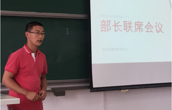 首先张驰老师发表讲话,他回顾自己参加学生会时的经历和感想,明确经管学院学生会 “人才服务战略”的定位,提出了“以纯真纯洁的心服务于学院的老师同学,让学生会成为学院的第一张名片”的目标,最后张驰老师希望学生会在完成基本任务的同时有所创新,并提醒大家劳逸结合,保重身体。