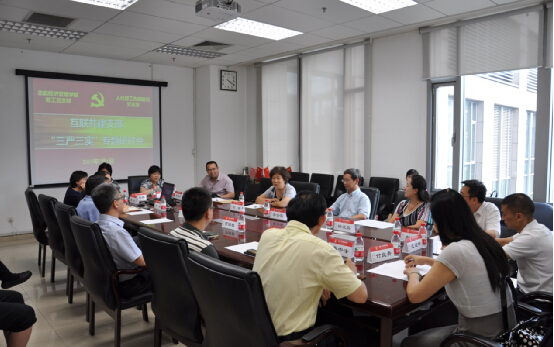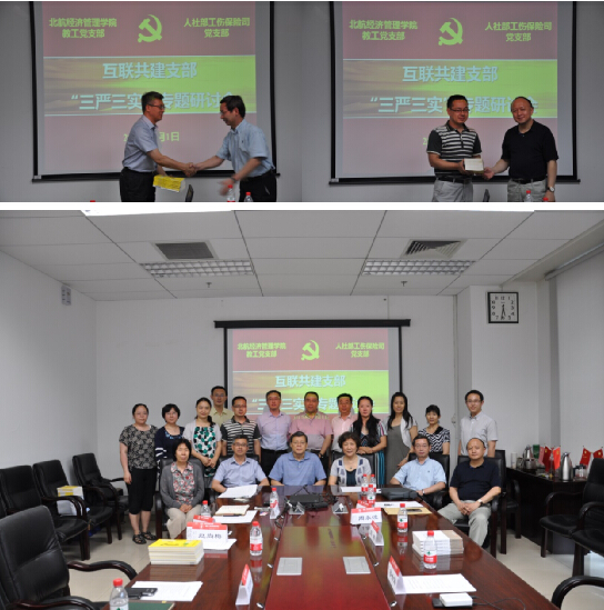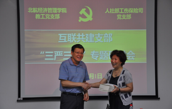 7月1日北航新主楼A612,经管学院教工联合党支部与人社部工伤保险司党支部举行互联共建活动,以“三严三实”为主题开展学习研讨。经管学院党委书记刘志新主持研讨会议。人社部工伤保险司支部书记、司长刘梅、副司长鲁士海、副巡视员、党支部副书记张晗等人社部工伤保险司支部全体成员,北航经管学院副院长贾国柱、研究生指导主任牟晖、党委副书记王喜忠、经管学院教工支部书记、党员代表等共二十余人共同研讨交流。