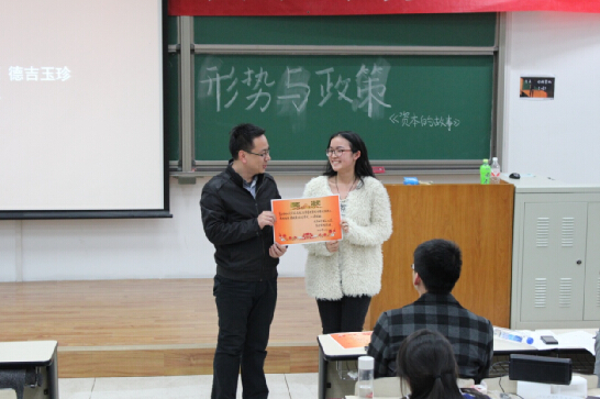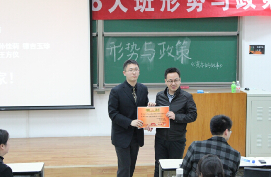 与上学期课堂相同,本次形势政策课分8个展示小组,展示内容为“资本的故事”纪录片观感。上半场前四个小组分别介绍了期货,债券,并购等金融相关的专业知识,主讲人通过制作精良的PPT、翔实的数据、精彩的案例和形象生动的比喻,向同学们展示了他们组的研究成果。后半场几乎全部围绕资产泡沫进行展示,每个组就不同泡沫形式进行了深入探讨并给出了自己的看法,有郁金香泡沫,日本资产泡沫和互联网泡沫,全场提问环节也异常积极热烈。在展示的最后,宋晓东老师给出了自己的建议和评价,王院长进行了总结,表示整场展示效果较好,相比上学期同学们进步也较大。最后由八位评委评出了本场的“最佳展示小组”“最佳提问者”以及“最佳回答者”等奖项。王书记代表颁奖。