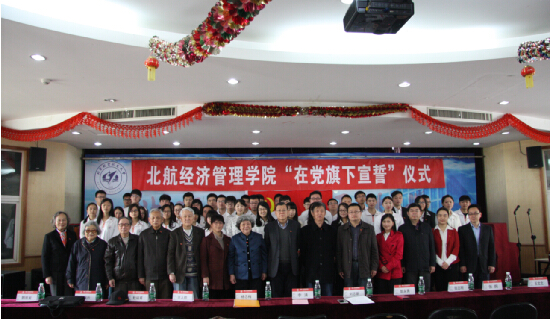 2015年4月11日上午,北航beat365亚洲版官网本科生、研究生新党员入党宣誓仪式——“在党旗下宣誓”活动在北航思源楼举行。学校部门领导组织部副部长张志刚、学生处副处长张炯、研究生工作部副部长王文文、离退休工作处副处长郭永秀、beat365官网领导经管学院党委书记刘志新、研究生指导主任牟晖、党委副书记王喜忠、退离休党支部书记李清应邀出席了本次活动,此外,经管学院离退休老党员及特邀组织员杨念梅、魏挹湘、朱桂芳、杜端甫、朱稼兴、王人骅以及本科生辅导员杨阳彤晞也来到了活动现场。