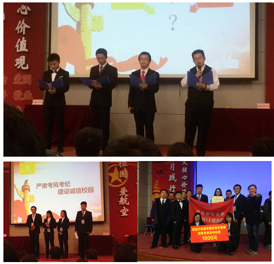 本次团史知识竞赛分为初赛、预赛和决赛三个过程,共有157支小班队伍、五百多名学生参加,经过初赛和复赛的筛选,最终成绩最为优异的四支参赛队伍晋级决赛。决赛分为三个环节进行答题,各环节形式新颖、题型丰富多样,涵盖团史、团务、时事政治等多个方面,题目难度也在逐级增加。而同学们的精彩表现更是让现场的每一位观众惊叹,精彩的抢答、默契的配合和熟练的知识掌握都体现了同学们台下的功夫和积累;各队同学你争我夺,比赛过程精彩纷呈、扣人心弦。此外,比赛还设置了活泼轻松的节目展示环节,给同学们一个自由展示、表达情怀的舞台。在最后的团日活动答辩环节中,两队选手针对北航“四爱精神”和诚信校园两个主题展开精彩答辩展示,并接受评委提问。最终,140813班以总分25分的优势独占鳌头,夺得本次比赛的冠军并获得1000元班级建设资金!同时,14级辅导员石晓倩老师获得竞赛优秀辅导员称号,谭烨同学成为团史竞赛优秀个人。