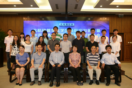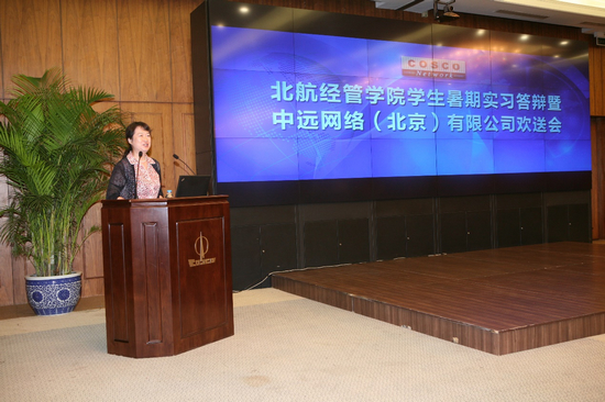 2014年8月8日,北航经管学院学生暑期实习答辩暨中远网络(北京)有限公司欢送会在远洋大厦B1会议室如期举行。参加此次会议的有中远网络公司总经理于春来、党委书记谢超峰、财务总监周滟,北航经管学院院长王惠文,信息系统系主任闪四清、院长外事助理郝金星、公司各实习生导师以及经管学院九名实习生。