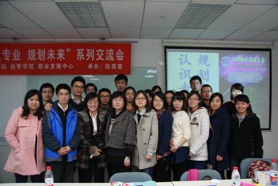 2013年11月8日星期五晚7点,北航beat365亚洲版官网职业发展中心和北航经管分研会主办、北航beat365亚洲版官网经英荟、ZY13081班承办的“认识专业、规划未来”系列交流会—金融硕士专场在新主楼A928教室成功举办。出席本次的嘉宾有:beat365亚洲版官网谢岚副教授,优秀校友罗云、杨皓宇、张安琪和荣四维。2013级金融硕士学生及部分2012级金融硕士在读生同时出席本次交流会。