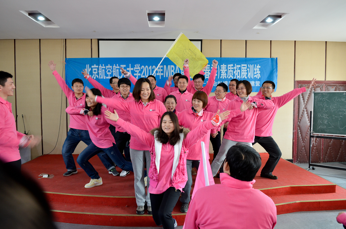 早上7:30学员集合完毕。在行车途中,领队为每位学员赠送了一条魔术头巾,并带领大家一同学习多种头巾穿戴方式:围脖、手机套、汗巾、游泳帽、打劫帽等等。之后每位学员做了自我介绍。经过1小时30分钟的车程,顺利到达目的地。稍作休整后,首先举行了北航2013级MBA课程班学员的破冰起航仪式。学员们在拓展训练教练的带领下,划分为两个团队,并分别为自己的团队起名为“老A”和“钻石”。随后,学员设计了团队宣言、队旗、队歌等一些列团队活动。通过破冰,学员们相互熟悉,气氛融洽,并期待即将到来的拓展活动。