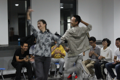 随后,王院长来到了32班的联谊会现场。32班的班长吴楠和杜苗寒霜同学分别以一支热舞将联谊会推到了高潮。吴楠同学将王院长请上舞台,共同表演了一支维吾尔族舞蹈,赢得了全体同学的热烈欢迎。节目过后,王院长亲切地问候了12级新生,与同学们交流后,激励同学们要懂得自我探索,并用在法国留学时的亲身经历告诉同学们要学会适应生活。王院长的讲解细致深入,不仅使大一新生,也使大二的门特们对大学有了更深刻的理解和认识,对未来的生活少了一分迷茫,多了一分坚定。