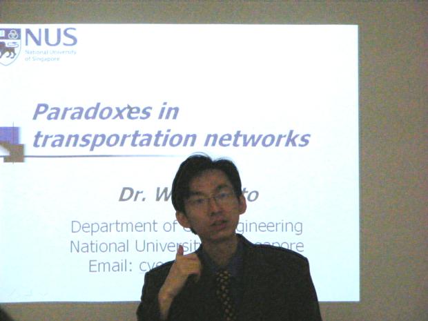 访问期间,Agachai博士在27日为我校师生做了“Stochastic transport network model and its implication to road pricing policy”和“Global optimization algorithm for mixed integer transport network design problem”两场学术报告,详细介绍了随机交通网络模型与网络设计全局优化的前沿问题,阐述了自己独到的见解。28日全天,Szeto博士为我校师生做了“Analysis of paradoxical phenomena in transportation networks”和“Modeling and solving the game theoretical formulation for the routing and scheduling hazardous material problem”两场学术报告,系统地介绍了交通网络悖论现象分析和运输中的对策论模型。报告会由黄海军教授主持,演讲讨论过程中,黄教授针对专家们的热点难点问题向师生们进行了深入浅出的评述和讲解,报告受到师生的热烈欢迎,在场学生与两位专家进行了充分的讨论和交流。
