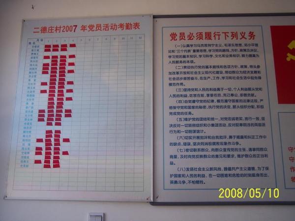 二德庄村位于昌平区百善镇东南部,现有在册人口396人,其中劳动力201人,目前就业176人。该村“十一五”规划将农业发展定位为:农业产业带动型,大力发展设施农业,创建名、特、优、新农产品生产基地,实施适度规模经营。村里共有正式党员31名,预备党员1名,积极分子1名,2006年被评为昌平区先进基层党组织;2007年,村党支部组织实施了“党员承诺制”活动,全部党员都做出并履行了自己的承诺。