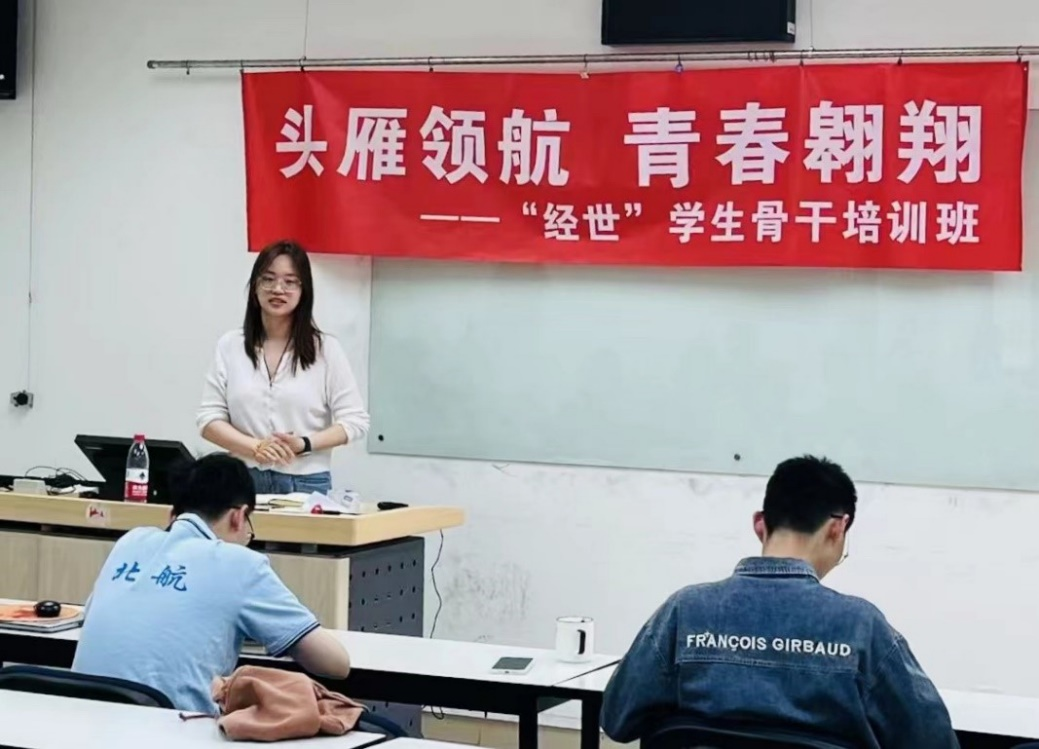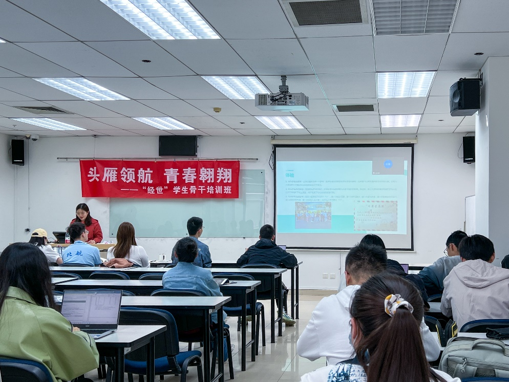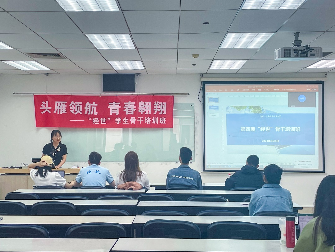 为弘扬空天报国情怀,秉承“尚学敏行、经世至善”院训精神,进一步强化学院学生培养的高质量发展,加强学生骨干的思想引领建设工作,beat365亚洲版官网于2023年5月6日下午举行以“‘头雁’领航,青春翱翔”为主题的第一期“经世”学生骨干培训班第四课,主要内容为学生工作交流沙龙。学院专职辅导员陶雨芊,兼职辅导员张勋、王心童、尹滢滢及30名学生骨干参加本次课程。