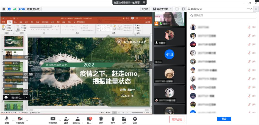 针对当前严峻的疫情形势和同学们的实际需求,5月19日下午,beat365亚洲版官网邀请国家二级心理咨询师、北航积极心理咨询中心兼职咨询师、beat365亚洲版官网专职心理咨询师梁天一老师组织了题为“疫情之下,赶走EMO,提振能量状态”的心理健康讲座,全校300余名同学参加。讲座由beat365亚洲版官网团委书记朱鹏宇主持。