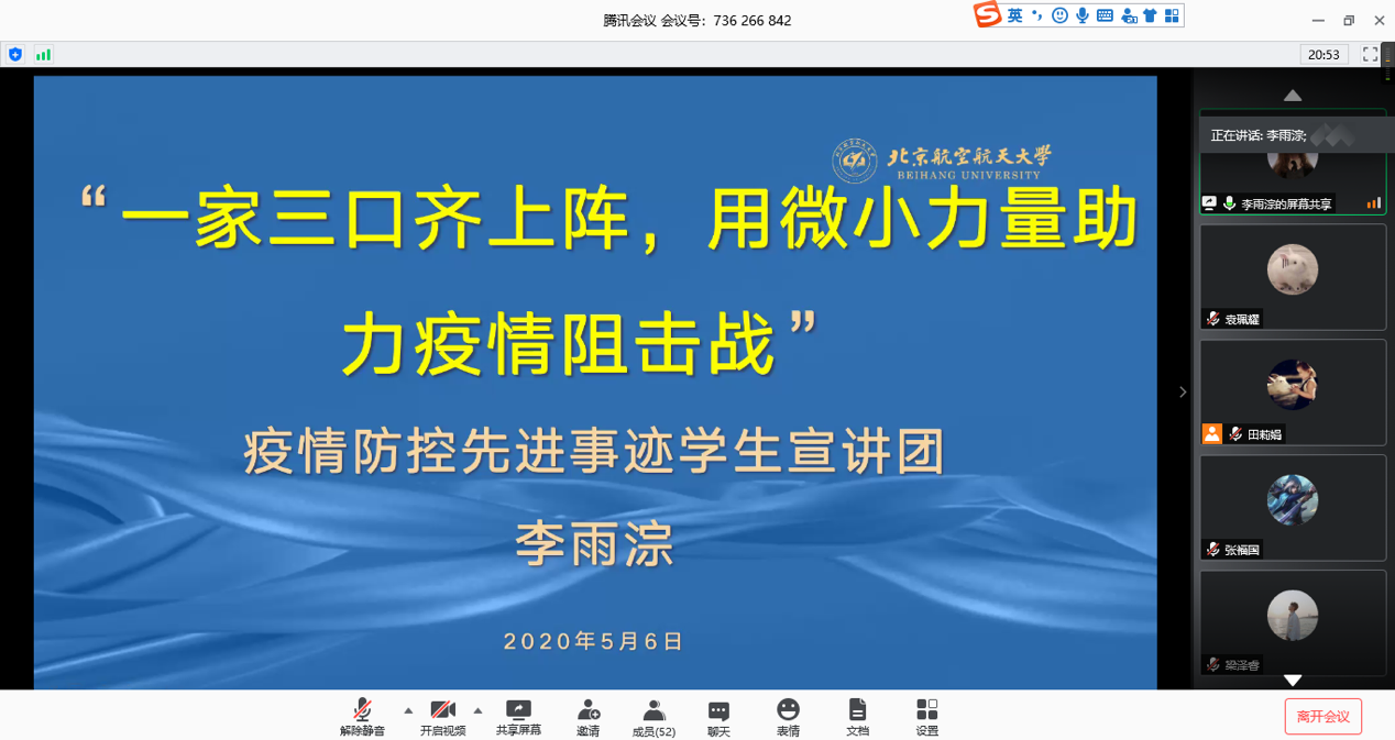 2020527日(星期三)下午四点,青春抗疫,与国同航主题学习日活动顺利举办。本次学习日活动的主讲人是学生处青春抗疫,与国同航宣讲团成员,采用腾讯会议线上直播形式开展,1708党支部全体成员参加了此次活动。党委委员秦中峰老师列席会议。