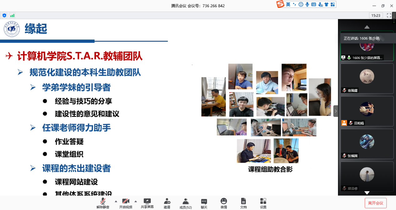 第二位宣讲人是来自计算机学院的张少昂同学,他向大家讲述了疫情期间自己在S.T.A.R.教辅团队中的工作经历。他们一方面为学弟学妹们提供学习的经验与技巧,另一面帮助老师完成课堂组织以及课程网站的建设工作。在疫情期间他们利用现代技术积极组织工作,完成本职工作,帮助同学解决疑难问题,最终实现线上线下教学实质等效的工作成果。