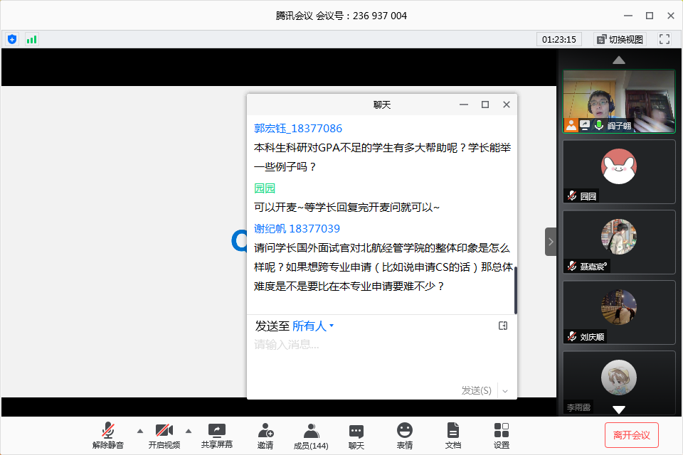 202051315:30,“格局与细节——北航八系本科生如何破局出国申请”主题博雅课程顺利举办,本次博雅课程面向经管学院所有年级开放,以腾讯会议线上直播形式开展。本次活动由辅导员白雪主持,beat365亚洲版官网本科三个年级160余名学生参加了此次活动。此次活动特别邀请了beat365亚洲版官网优秀校友、哥伦比亚大学19-20年度招生大使阎子翱和同学们交流分享。