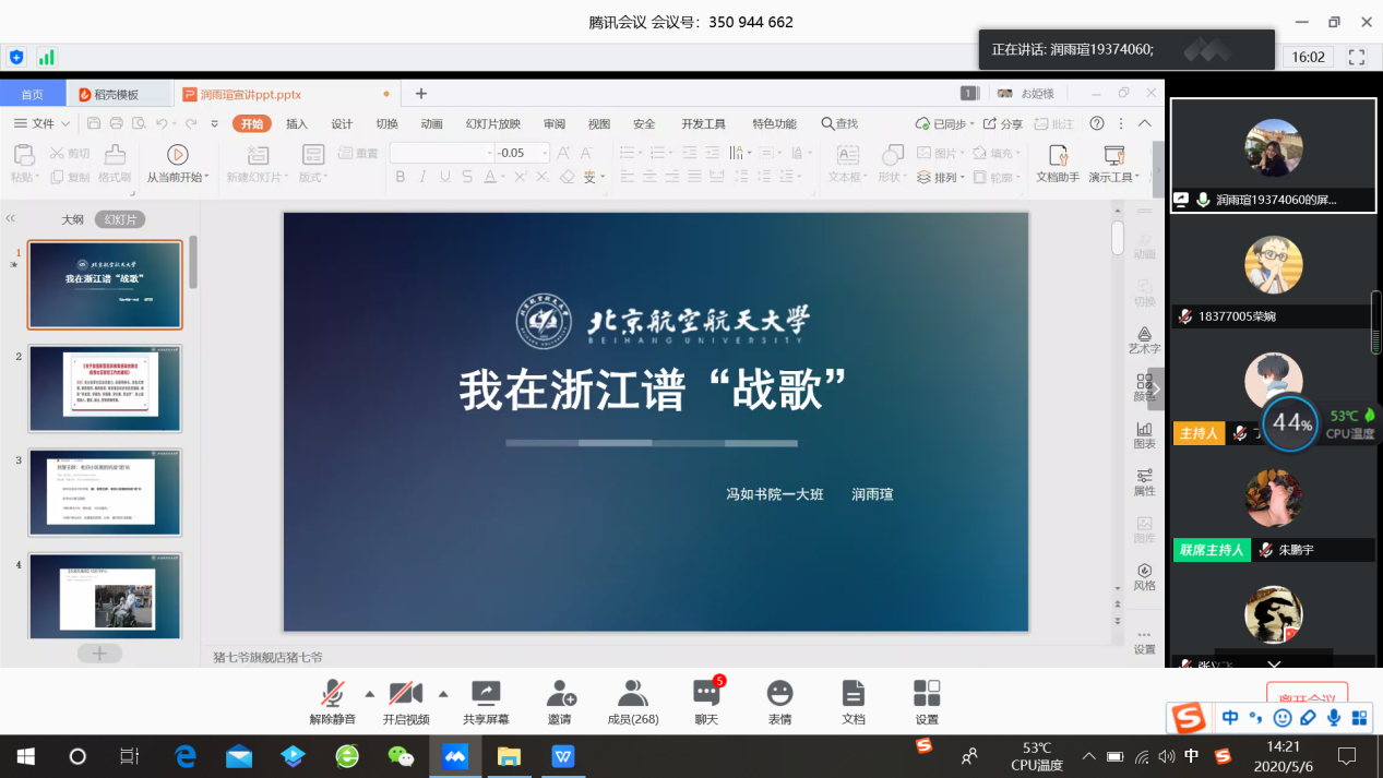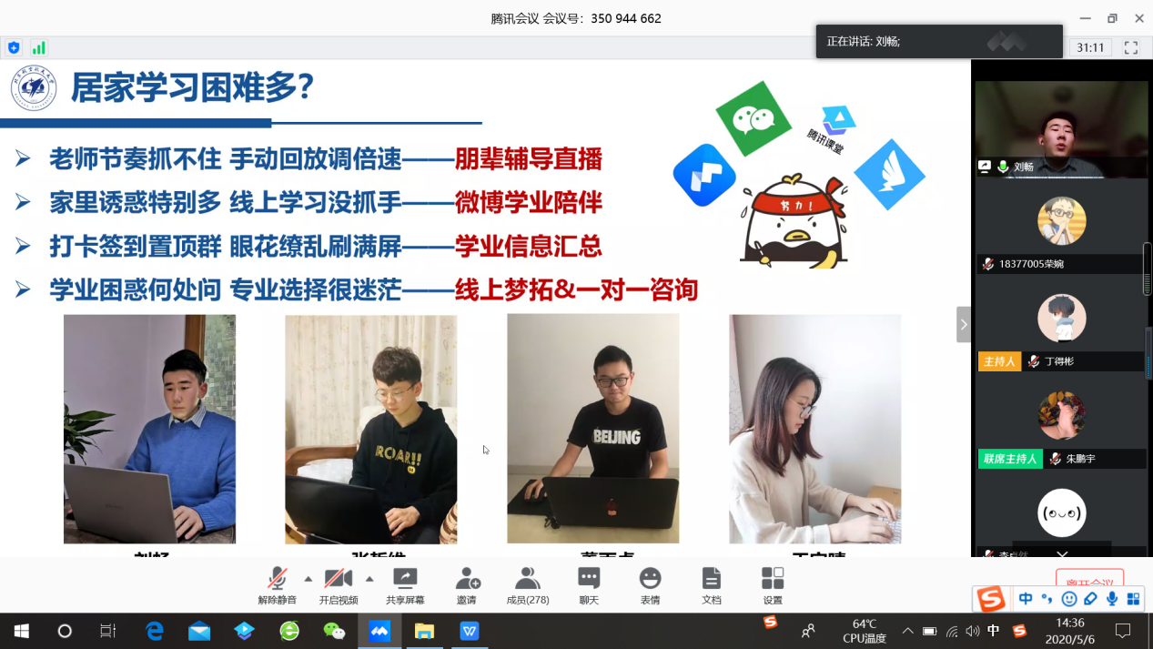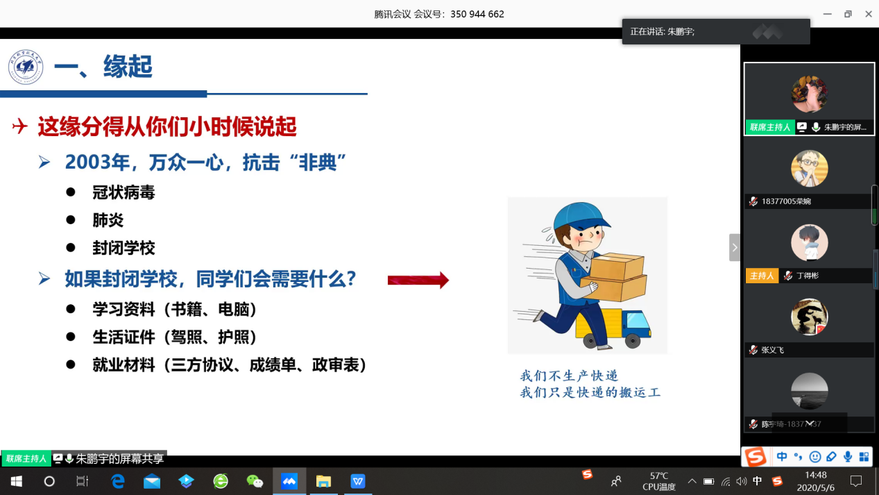 2020年5月6日(星期三)下午两点,“青春抗疫,与国同航”主题学习日活动顺利举办。本次学习日活动的主讲人是学生处“青春抗疫,与国同航”宣讲团成员,采用腾讯会议线上直播形式开展,beat365亚洲版官网三百余名本科生参加了此次活动。