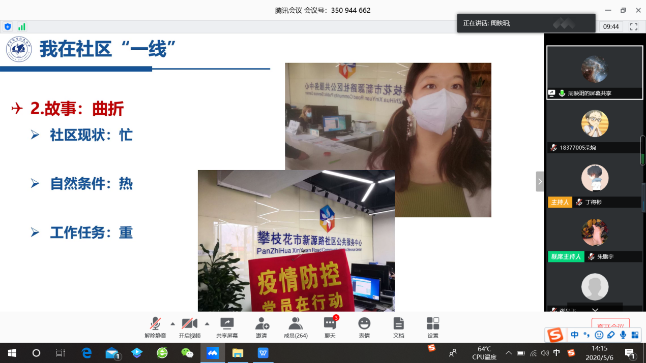第二位宣讲人是来自人文学院的周映玥同学讲述她在四川守社区的感人点滴。她被金银潭的张定宇院长、不远千里赶赴武汉的“送菜大军”所感动和影响,决定尽自己一封绵薄之力,带上自己的弟弟一起,前往社区开始了她忙碌的社区工作。社区工作忙碌而琐碎,但“党员在行动”的红袖标和妈妈的鼓励给了她坚持下去的动力。