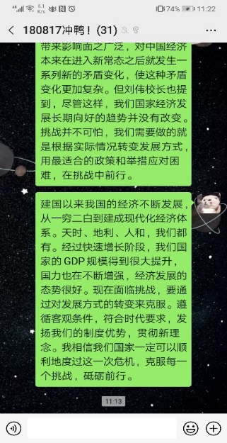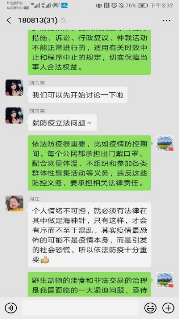 观看疫情防控公开课后,学生们感触良多,有位在武汉的学生谈到国家的治理体系的优势:“应对疫情,中国的‘操作’再次证明,制度优势是一个国家的最大优势。对于一个拥有14亿人口的大国而言,有如此组织动员能力、动员规模、动员效率,这是国家制度和国家治理体系、治理能力的集中体现”,有的谈到大国担当和世界命运共同体,中国能量、中国精神就这样在大家一言一语的讨论声中被一点一滴地
