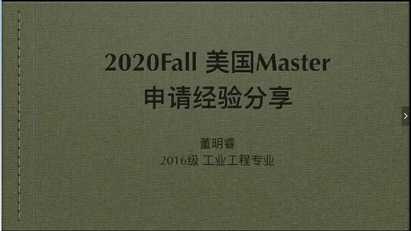 之后,董明睿学长从个人情况、申请心得分享、现阶段建议、选校建议、关于中介五个方面来分享自己的经验。学长强调要重视课程成绩,尽早讲语言考到理想成绩,同时要重视任何个可能丰富申请背景的机会。