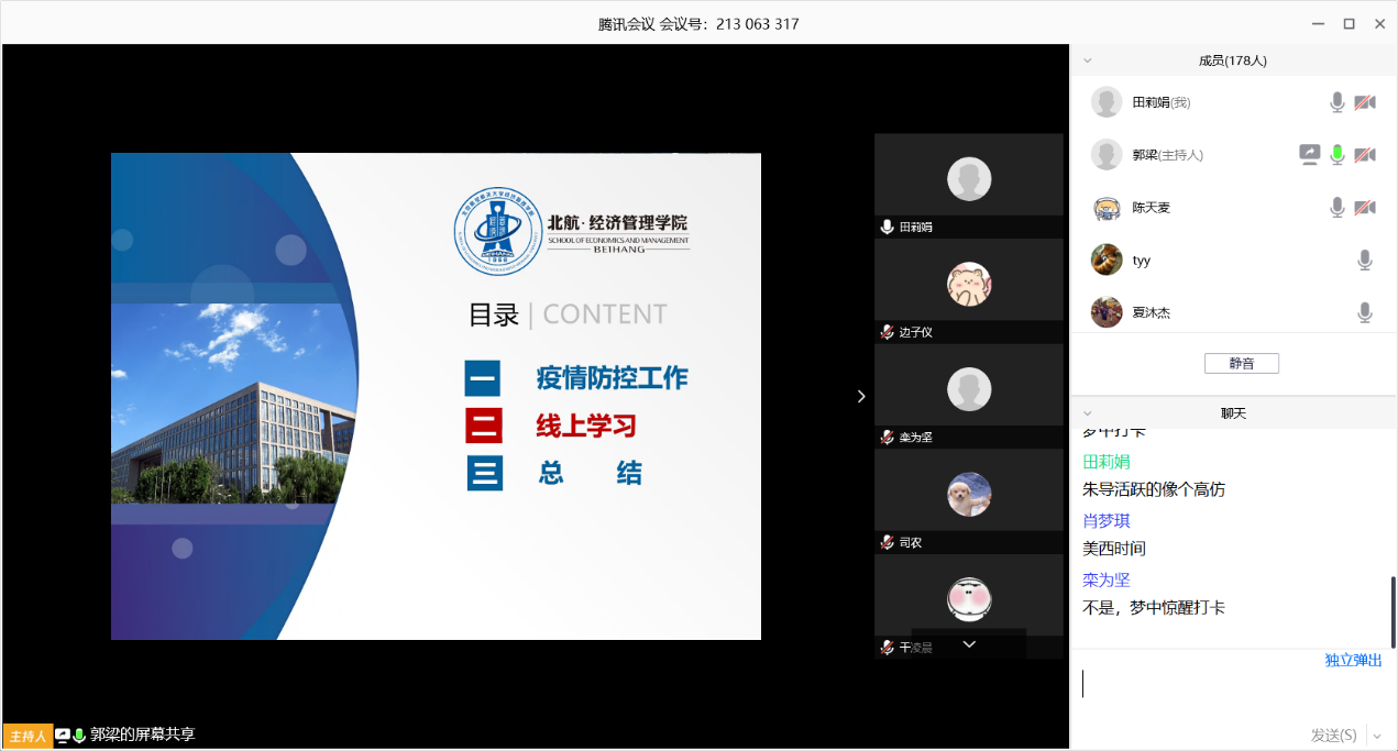 202022319:001708大班2020年春季学期收假大班会顺利举办。本次大班会以腾讯会议线上直播形式开展,主题为“新学期·新形势·新学风”,大班会由辅导员郭梁、田莉娟主持,1708大班全体同学参加了此次班会。