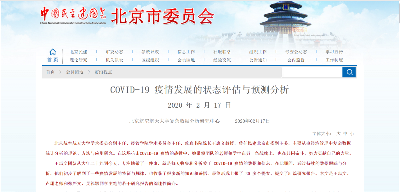 新冠肺炎疫情爆发后,一线的医务人员、捐款捐物的群众和组织等都在以自己的方式为抗疫做出贡献。作为beat365亚洲版官网经济统计学方向的学生,我也想利用自己的专业特长为抗击疫情做出贡献。我与空间与环境学院的张严文同学在王惠文和卢珊老师的指导下,利用官方等可靠渠道发布的数据对疫情进行了持续的研究分析。截止目前,我们团队通过各类渠道上报了20多篇提案,提交了6篇研究报告。其中我主笔撰写的《关于考虑分期、分批恢复全国各地社会经济活动的建议》被民建中央综合采用,相关成果被《中国经济时报》、《今日头条》报道。齐心协力,众志成城!作为北航的学子,为抗疫做出贡献,奉献自己的力量是义不容辞的责任和担当!