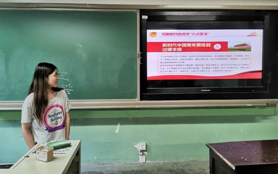 预备党员董明睿带领团员们学习了习近平总书记在纪念五四运动100周年大会上的重要讲话精神,重新学习五四运动的精神和重要意义,学习习近平总书记对广大青年的六点要求。董明睿激励在座的团员和青年党员、预备党员要牢记习近平总书记的叮嘱,时刻热爱伟大祖国,胸怀远大理想,磨练自身本领,坚定信念,在将来为社会主义现代化建设和中华民族伟大复兴事业做出自己的贡献。