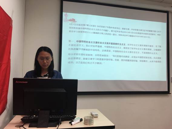完成预备党员发展工作之后,全体党员进行了这一阶段对于学习强国的学习内容的交流。首先,刘畅同志围绕着习近平总书记的重要文章《关于坚持和发展中国特色社会主义的几个问题》做出交流报告。习近平总书记的文章指出三个重要问题:第一,中国特色社会主义是社会主义而不是其他什么主义;不同历史时期本质上都是我们党领导人民进行社会主义建设的实践探索;第三,马克思主义必定随着时代、实践和科学的发展而不断发展,不可能一成不变,社会主义从来都是在开拓中前进的。刘畅同志表示,道路问题是关系党的事业兴衰成败第一位的问题,道路就是党的生命。我们党在革命、建设、改革各个历史时期,坚持从我国国情出发,探索并形成了符合中国实际的新民主主义革命道路、社会主义改造和社会主义建设道路、中国特色社会主义道路,这种独立自主的探索精神,这种坚持走自己路的坚定决心,是我们党不断从挫折中觉醒、不断从胜利走向胜利的真谛。