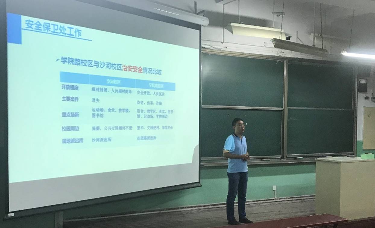 第一环节,由校保卫处孙老师进行转校区安全专题教育。孙老师首先介绍了学院路校区的基本布局、两校区管理方面的异同、学校安全保卫处的主要职责等等。接下来,老师结合历年大学生安全问题的案例,向同学们讲解了遭遇危机事件后的正确应对办法。最后,老师提供了北航校园安全相关的地址和电话,希望同学们增强安全防范意识,提高安全防范能力。孙老师的演讲全面细致又不失幽默,同学们深刻认识到了校园安全的重要性。