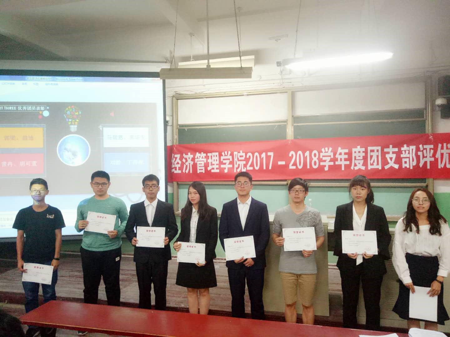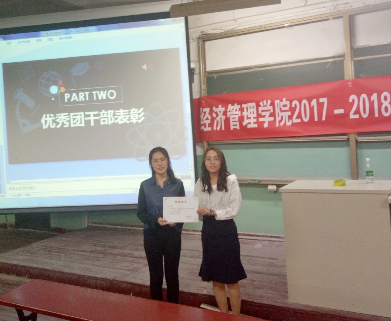 随后是表彰环节。经过前期民主评选,王雨晴同学高票获评为1508大班“优秀团干部”,郭梁、翁迪、马晨恩、常培宏、曾冉、胡可萱、刘毅、丁得彬八名同学获得“优秀团员”的荣誉,王雨晴及常培宏分别作为优秀团干部以及优秀团员代表在会上发表感言。