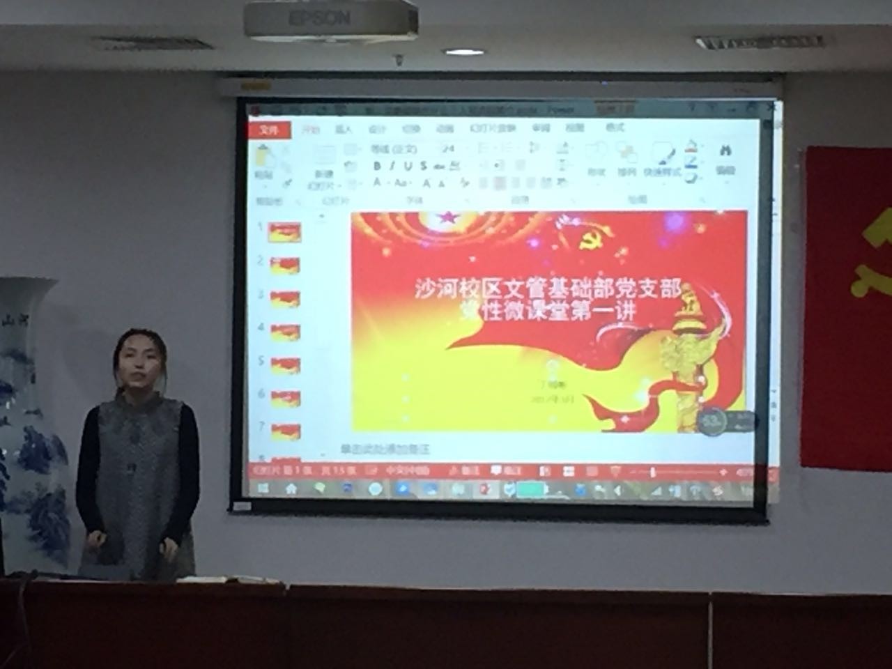 2017年3月12日晚六点,文管基础部党支部在沙河校区4号实验楼106室成功开展了本学期党性微课堂第一讲。此次微课堂主要就“如何成为一名中共党员”这一主题进行介绍。文管基础部党支部书记王晨,其他支部成员,beat365亚洲版官网以及新媒体艺术与设计学院的积极分子,共50余人参加了此次活动。活动由党支部书记王晨主持。