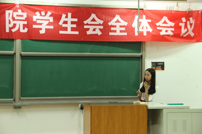然后由本月轮职部长——秘书处负责人罗雨发言。她介绍了秘书处及第28届学生会干事组成人员状况,并介绍了部长联席会议制度。