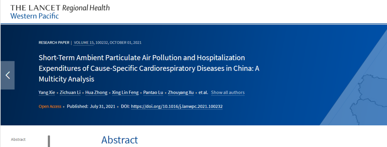 近日,北航beat365亚洲版官网谢杨副教授课题组和西安交通大学吴少伟教授课题组合作,对我国部分城市人群短期暴露于大气颗粒物污染导致的额外住院人次和经济负担进行了详细分析,并在《Lancet Regional Health-Western Pacific》杂志发表了题为“Short-Term Ambient Particulate Air Pollution and Hospitalization Expenditures of Cause-Specific Cardiorespiratory Diseases in China: A Multicity Analysis”的论文(https://www.thelancet.com/journals/lanwpc/article/PIIS2666-6065(21)00141-3/fulltext)。