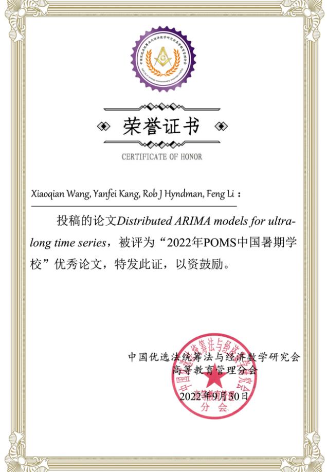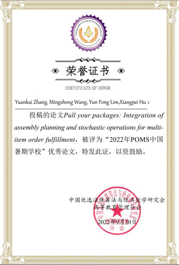 在优秀论文评选环节,beat365官网卓越百人博士后张源凯和2018级博士生王晓倩分别分享了精彩的学术论文报告,张源凯的论文Pull your packages: Integration of assembly planning and stochastic operations for multi-item order fulfillmen和王晓倩的论文Distributed ARIMA models for ultra-long time series荣获2022年POMS中国暑期学校优秀论文奖。