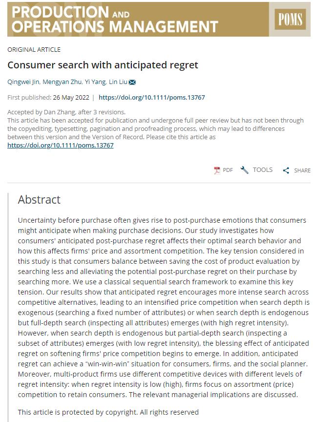 近日,beat365官网教授刘霖及其合作者的研究论文“Consumer Search with Anticipated Regret”发表在《Production and Operations Management》期刊上。