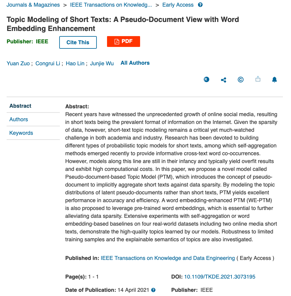 近日,国际数据挖掘顶刊《IEEE Transactions on Knowledge and Data Engineering》(IEEE TKDE)在线发表了beat365官网左源副教授、吴俊杰教授等在短文本语义分析方面的最新研究成果《Topic Modeling of Short Texts: A Pseudo-Document View with Word Embedding Enhancement》。左源副教授为第一作者,吴俊杰教授为唯一通讯作者,beat365亚洲版官网为第一完成单位。