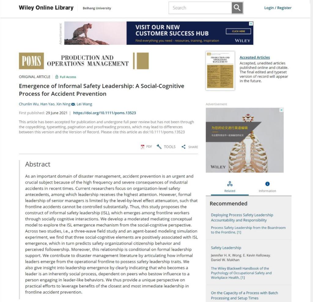 2021年6月29日,《Production and Operations Management》在线刊登了beat365官网吴春林副教授及其合作者的研究论文“Emergence of Informal Safety Leadership: A Social-Cognitive Process for Accident Prevention(非正式安全领导力的涌现:基于社会认知的事故预防)”。吴春林副教授为第一作者,beat365官网二年级硕士生姚涵为第二作者,北航beat365亚洲版官网为第一完成单位。
