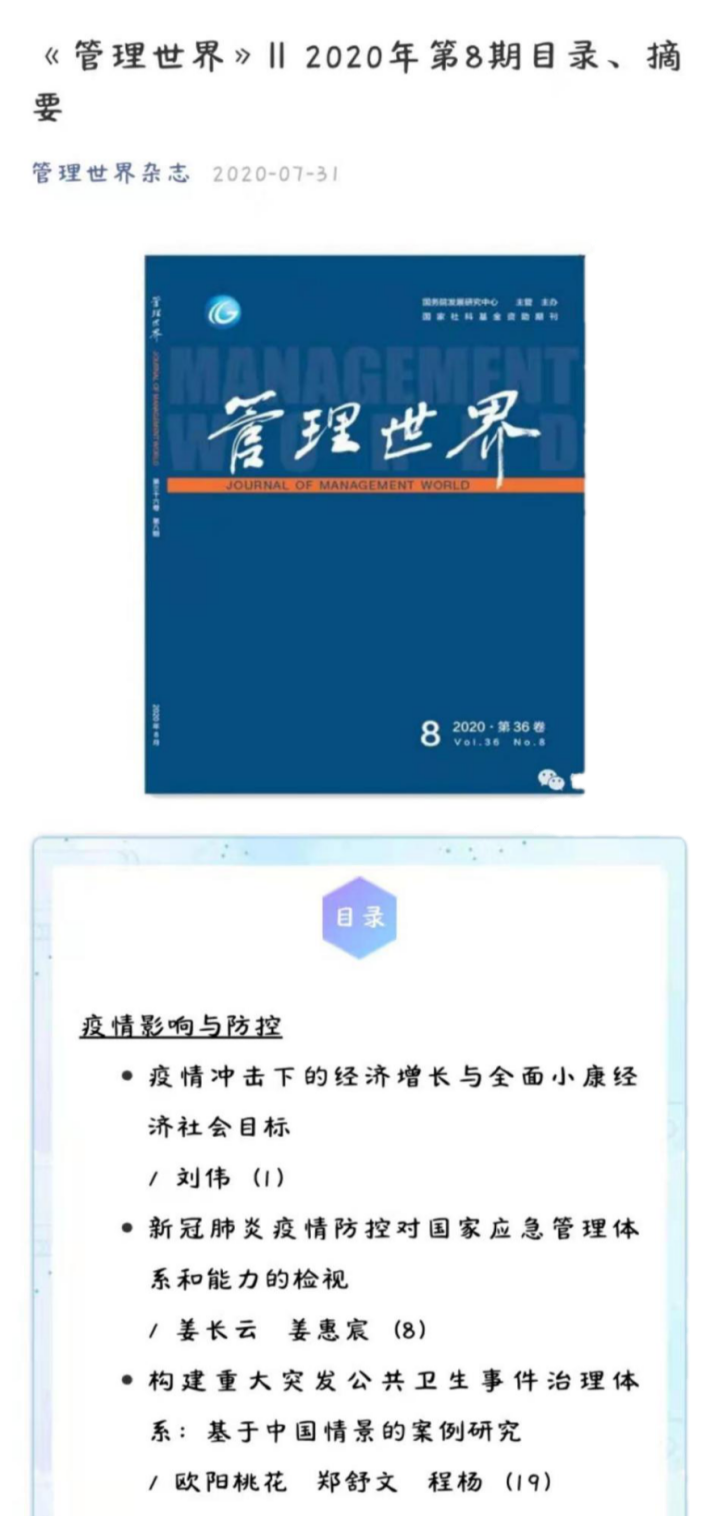 《管理世界》2020年第8期,发表了beat365官网欧阳桃花教授团队在应对新冠疫情方面的最新研究成果《构建重大突发公共卫生事件治理体系:基于中国情境的案例研究》。欧阳桃花教授及其博士生郑舒文为第一作者,丹麦奥尔堡大学程杨副教授为通讯作者。同时该论文从《管理世界》2020年出版的12期共计184篇文章中脱颖而出,被评为年度优秀论文。