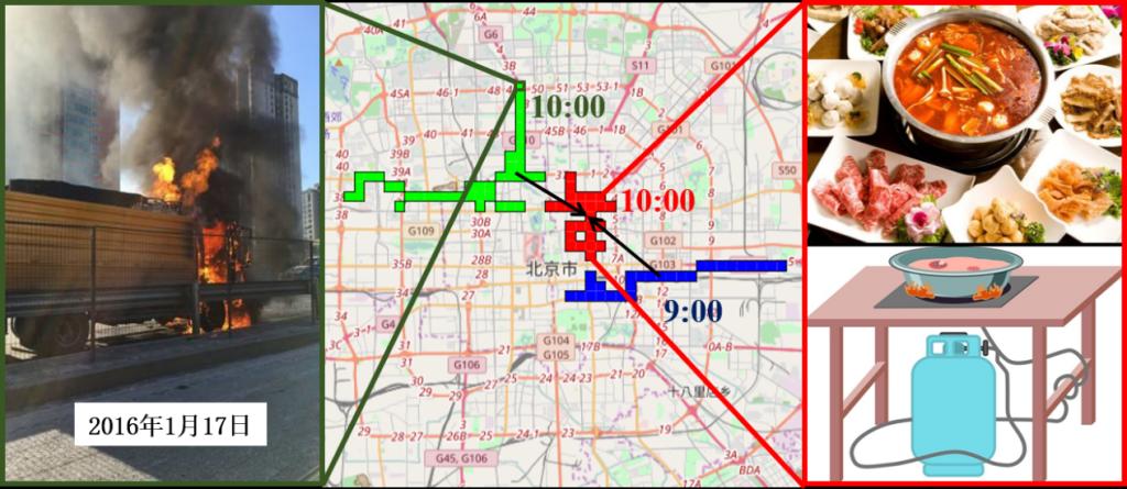 分析结果不能解释这一区域为何成为风险源头。基于业务人员的经验,该区域的风险主要源自餐馆对液化气的需求。该地区是北京文化休闲和娱乐区,著名的“簋街”特色小吃一条街就在这里,其火锅、烤鱼、麻辣小龙虾等特色餐饮吸引了众多的食客,也导致餐馆对煤气罐等危险货物的需求居高不下。运输煤气罐的车辆从西北和东面两个方向进入簋街,从而也造成了这两个区域的高风险。例如,2016年1月17日在绿色区域发生的一起危险品运输车辆燃烧事故,该车的目的地就是簋街。基于这一原因,后续治理采用了铺设天然气管道的方式,使该地区告别了煤气罐时代,有效降低了该地区和沿途路径上的风险。